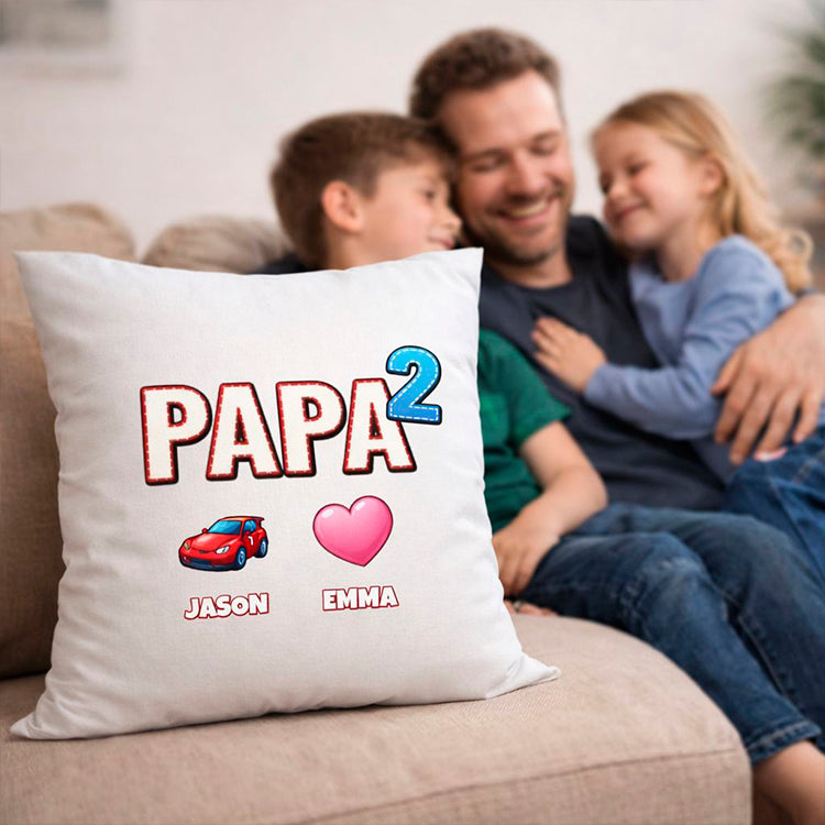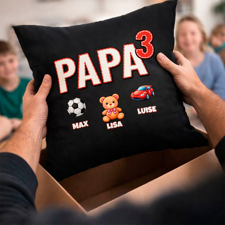 Dieses personalisierte Papa Kissen im "Papa hoch"-Design wird mit den Namen und Symbolen deiner Kinder zu einem einzigartigen Erinnerungsstück.