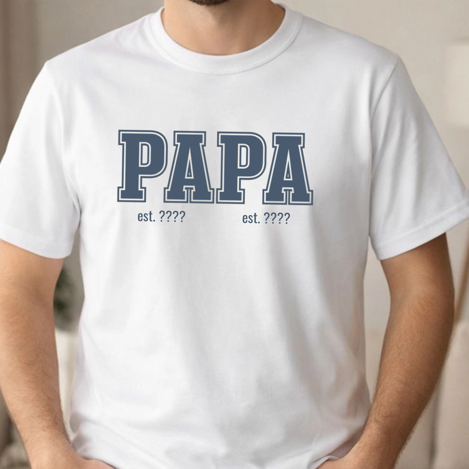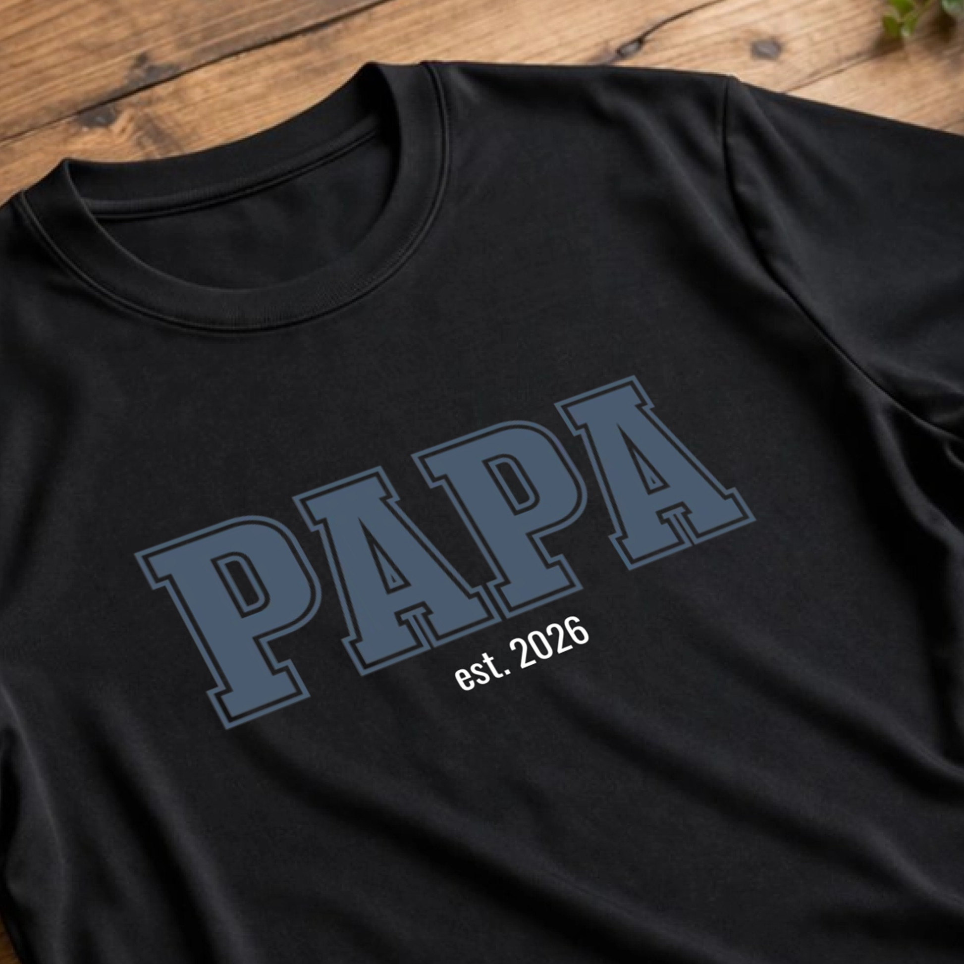 Mit „Papa est.“ und deinem Wunschjahr entsteht ein Design, das für den Beginn von etwas ganz Großem steht. Alternativ kannst du auch einen eigenen Text wählen und das Shirt genau so gestalten, wie es zu euch passt.